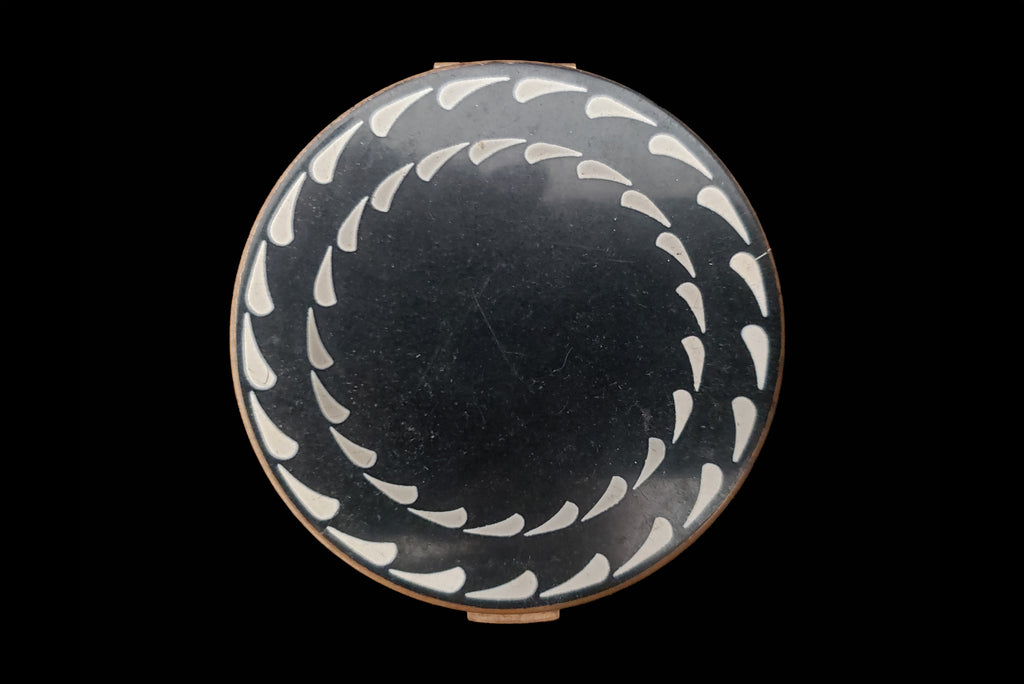 1930s Vintage Art Deco Black and White Enamel Round Gold Metal Make-up Mesh Compact by Elgin