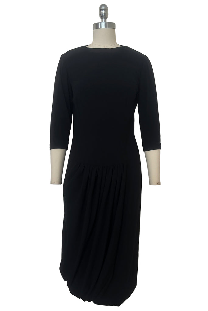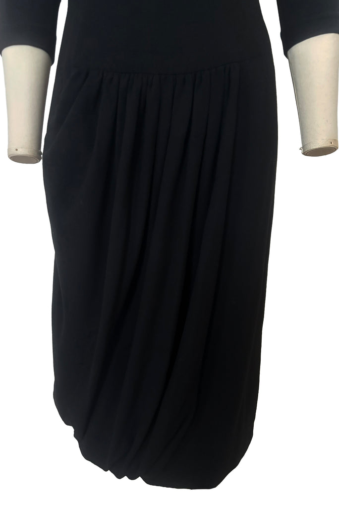 What truly sets this dress apart is the extraordinary draped wrap skirt. While technically a wrap design, the skirt is gathered at the front, with the fullness drawn and swept to one side, creating sculptural movement and volume concentrated toward the hem. The result is a dynamic, asymmetrical drape rarely seen in vintage garments, both striking and wearable.