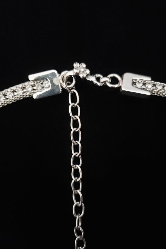 - Material: Silver tone metal, metal mesh, rhinestones.