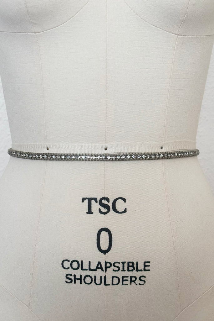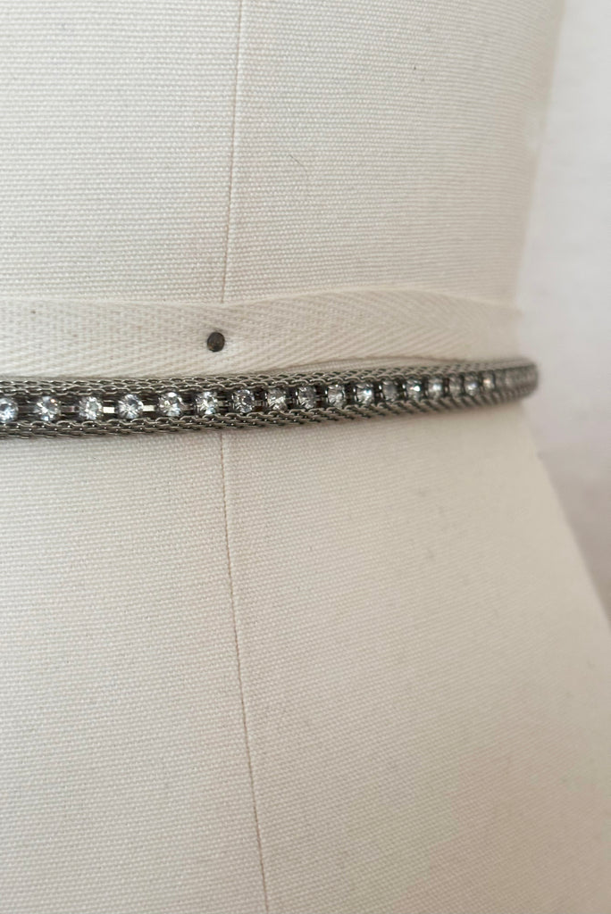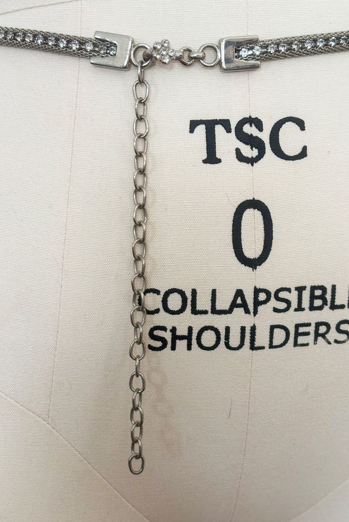 Elevate your style with this stunning 1960s silver metal mesh and rhinestone adjustable belt. Crafted with intricate metal mesh, this belt exudes a vintage charm. A row of dazzling round clear rhinestones run through the center, adding a touch of sparkle and glamour to any outfit. What makes this belt truly special is its rare large to extra-large size, providing a comfortable and adjustable fit for waist sizes ranging from 31 to 37 inches. Whether you're dressing up for a special occasion or adding a touch of elegance to your everyday look, this belt is a perfect accessory choice. Embrace the timeless beauty of vintage fashion with this remarkable silver metal mesh and rhinestone belt.