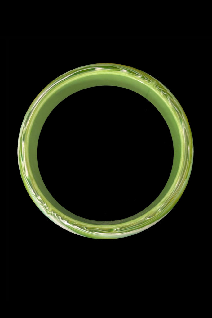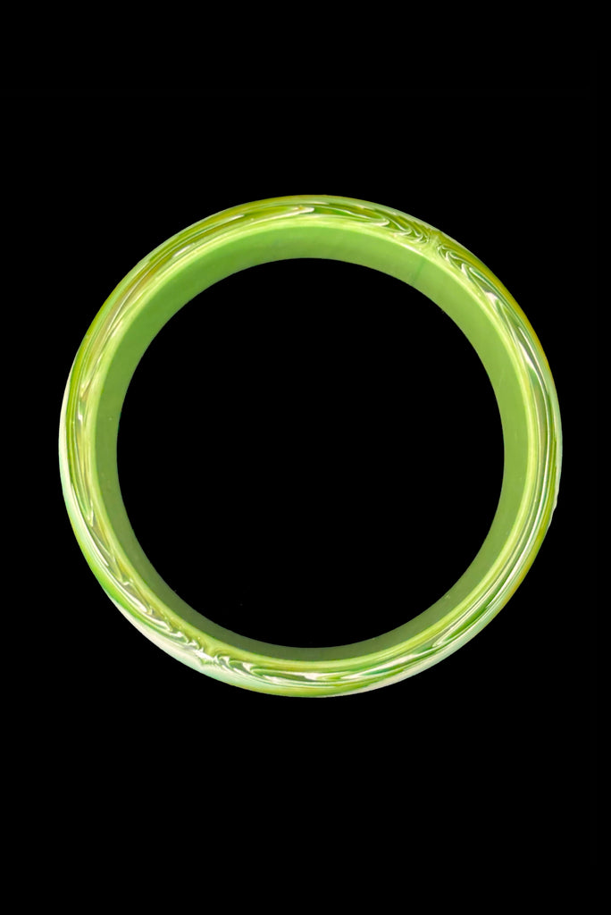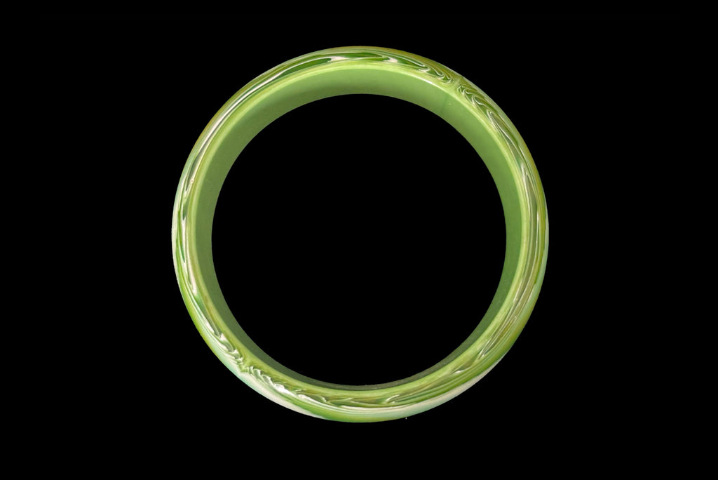1960s Vintage Feathered Green, Chartreuse, and White Lucite Plastic Bangle Bracelet