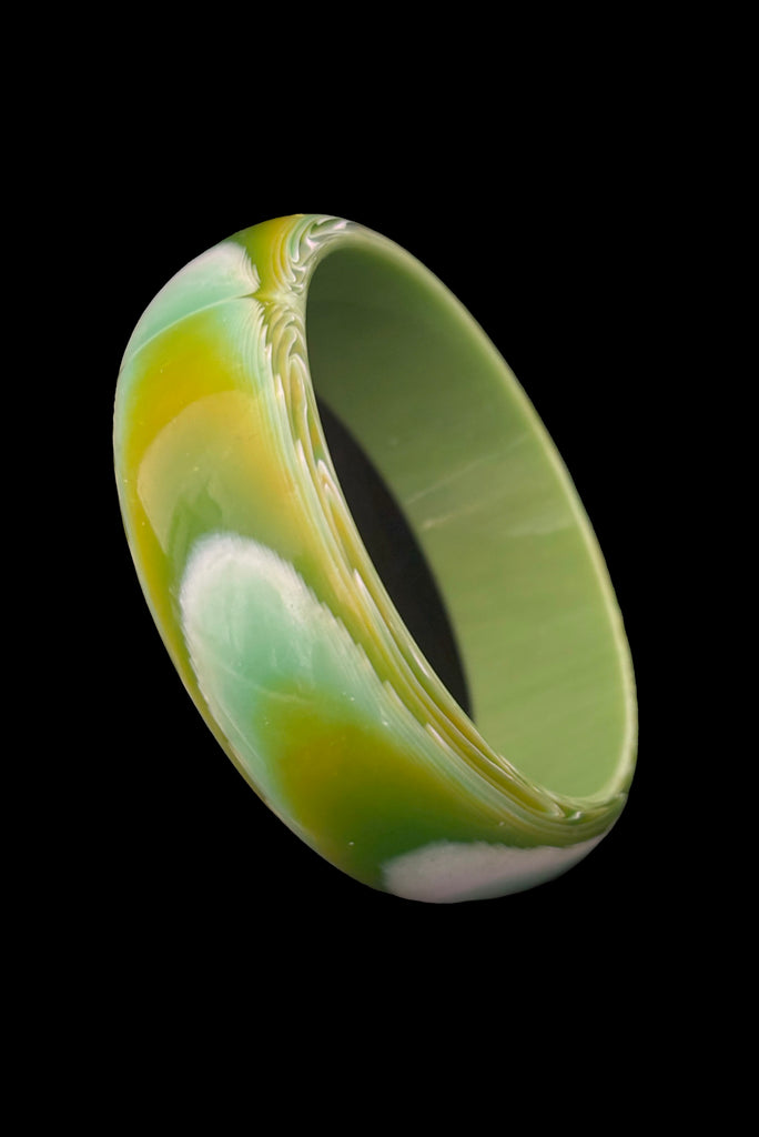 Vertical perspective view of 1960s vintage green, chartreuse, and white feathered Lucite plastic domed bangle bracelet.