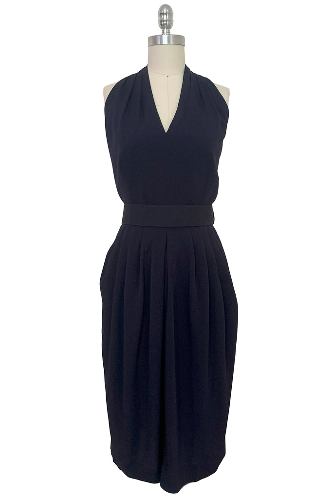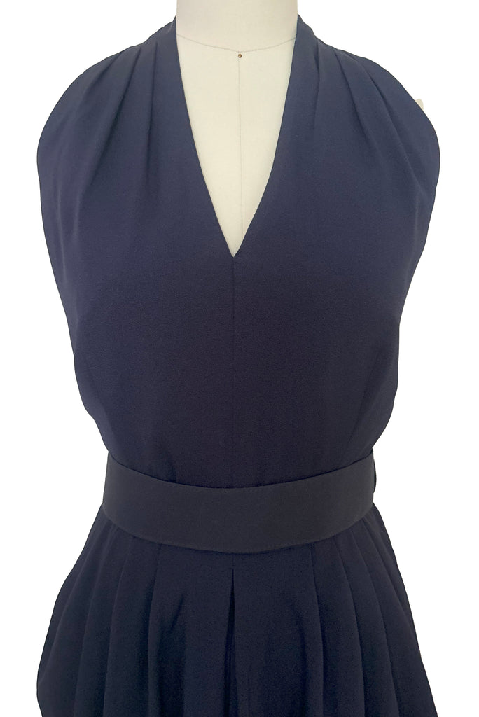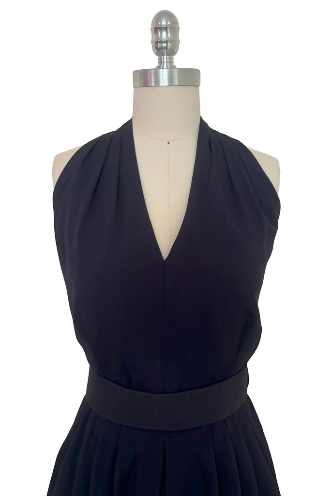 Make a stylish statement with this 1990s navy dress by BB Collections. Crafted from dark blue crepe fabric, this sleeveless dress showcases a flattering halter v-neckline and a slim draped skirt, exuding an effortlessly chic and sophisticated vibe. The keyhole open back adds a touch of allure and modernity to the design. Complete with a matching belt, this dress offers versatility and allows you to accentuate your waist for a more defined silhouette. Whether you're attending a daytime event or an evening affair, this dress is the perfect choice for a polished and fashionable look. Elevate your wardrobe with this timeless and elegant navy dress by BB Collections.