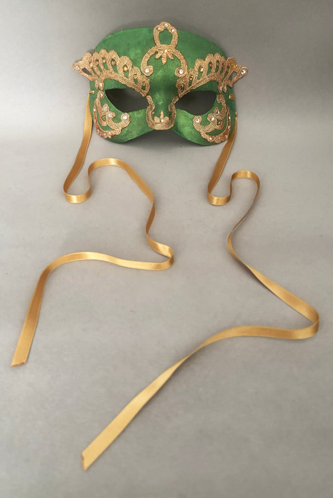 Vertical flat view of 1990s gold Lurex lace, gold Swarovski crystal, and metallic green painted half mask with gold satin ribbon ties.
