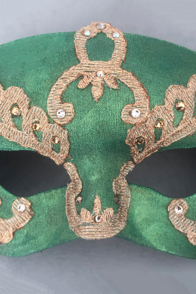 Vertical detail view of 1990s gold Lurex lace, gold Swarovski crystal, and metallic green painted half mask with gold satin ribbon ties. Showing the light gold and gold Swarovski crystals.