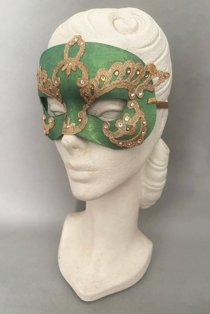 Horizontal 3/4 view of 1990s gold Lurex lace, gold Swarovski crystal, and metallic green painted half mask with gold satin ribbon ties. Showing the mask on a mannequin head.