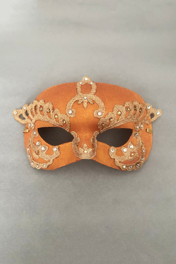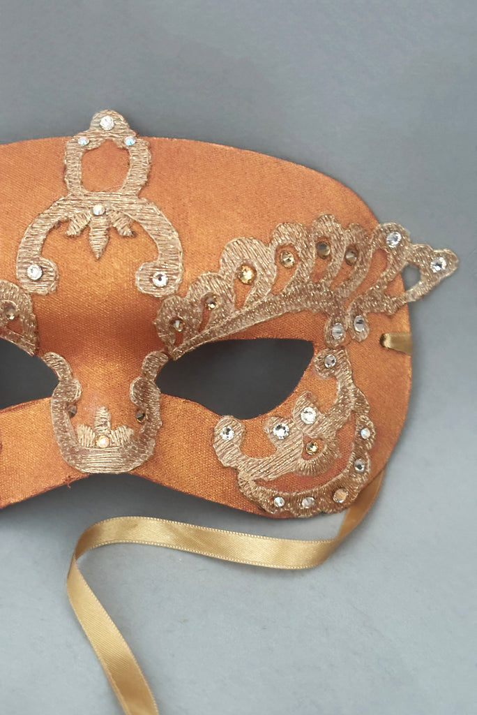 It is beautifully embellished with gold Lurex lace and sparkling Swarovski crystals in two shades of gold, adding rich texture and elegant shimmer. The mask secures comfortably with gold satin ribbon ties, making it easy to adjust for the perfect fit.