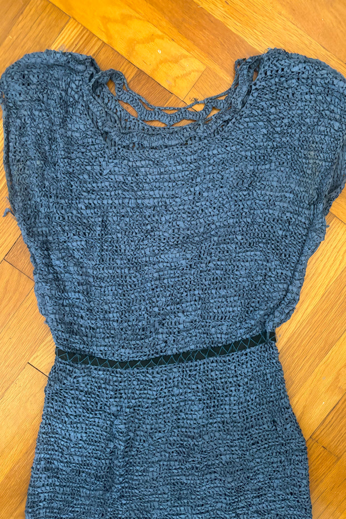 Elevate your wardrobe with this rare and beautifully crafted piece, embodying the spirit of a glamorous past. Whether you're attending a special occasion or simply embracing retro style, this periwinkle blue ribbon crochet dress promises to be a cherished addition to your vintage-inspired collection.