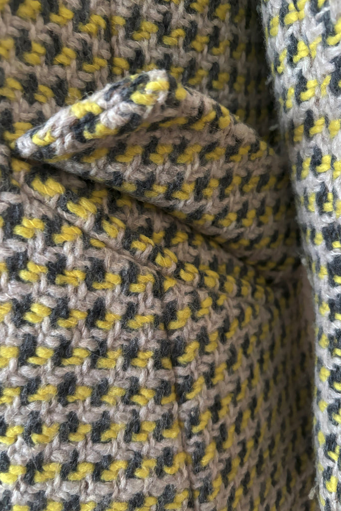 Detail view of 1960s vintage citron yellow, gray, and white bracelet sleeve, knee length wool coat, by Paul Blumenstein, size small to medium. Showing a close-up of the yellow, gray, and white chunky woven wool.