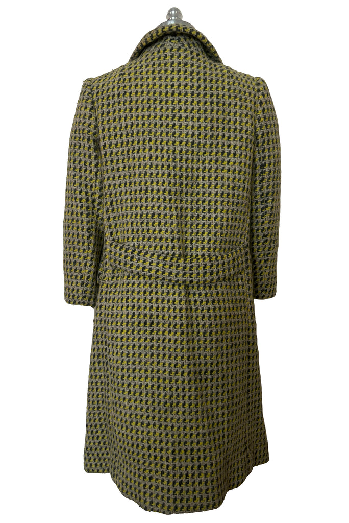 Back view of 1960s vintage citron yellow, gray, and white bracelet sleeve, knee length wool coat, by Paul Blumenstein, size small to medium. Showing the belted back.