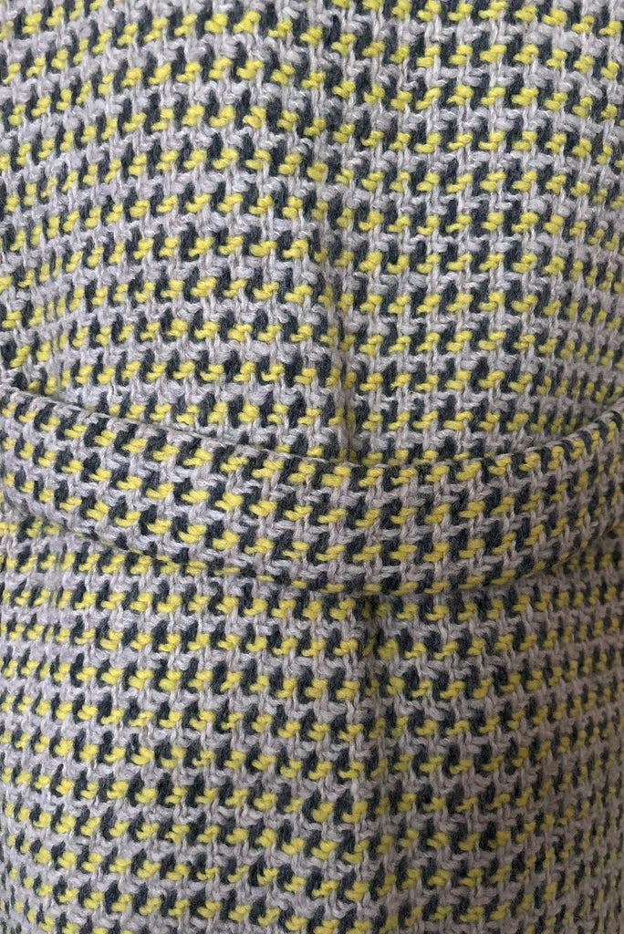 Detail view of 1960s vintage citron yellow, gray, and white bracelet sleeve, knee length wool coat, by Paul Blumenstein, size small to medium. Showing the pocket flaps.