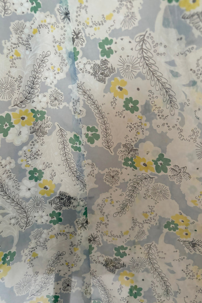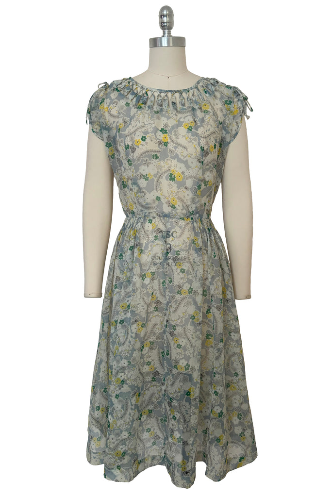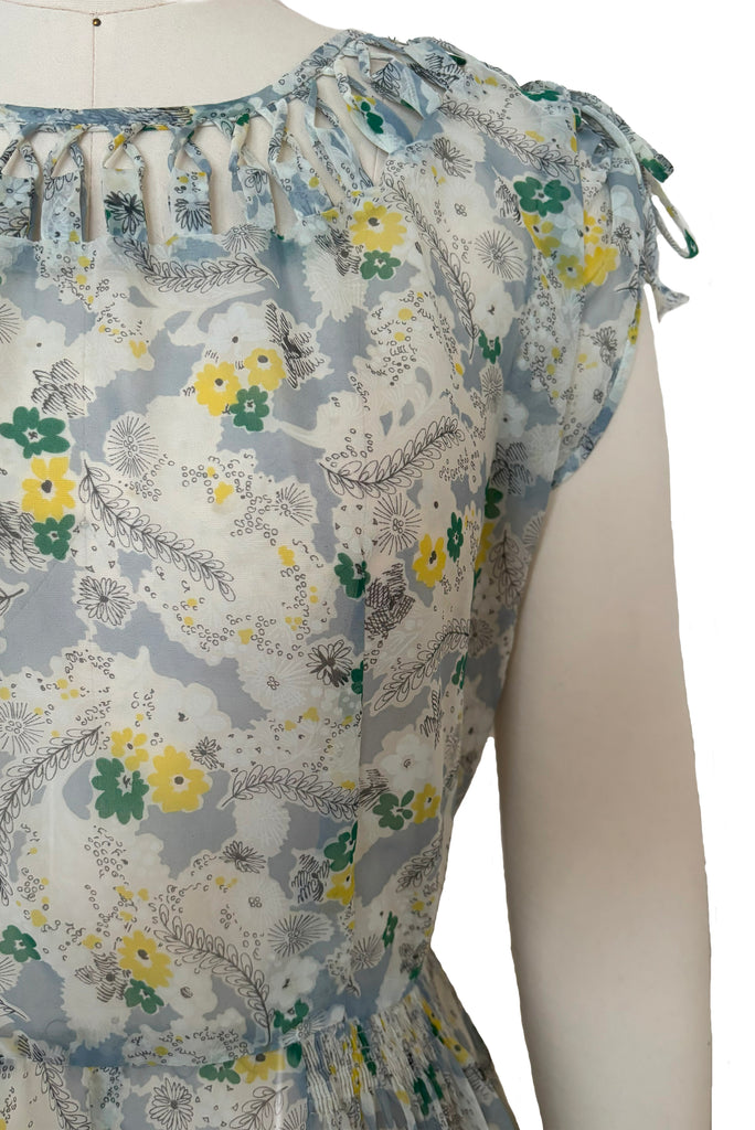 Capture the enchanting essence of the 1940s with this spiderweb floral dress. A delightful blend of late 30s to early 40s charm, this sweet sheer dress boasts a cutout neckline with a lacing detail and chic gathered short sleeves. The crisp floral print showcases green and yellow flowers intertwined with small white spiderwebs on a backdrop of pale blue and white. The dress is elegantly secured with a metal zipper along the side. Embrace the vintage allure of this dress and make a timeless statement in retro elegance.
