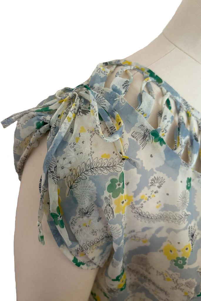 1940s Sheer Blue, White, Yellow, and Green Floral Spiderweb Novelty Printed Nylon Dress, Small to Medium