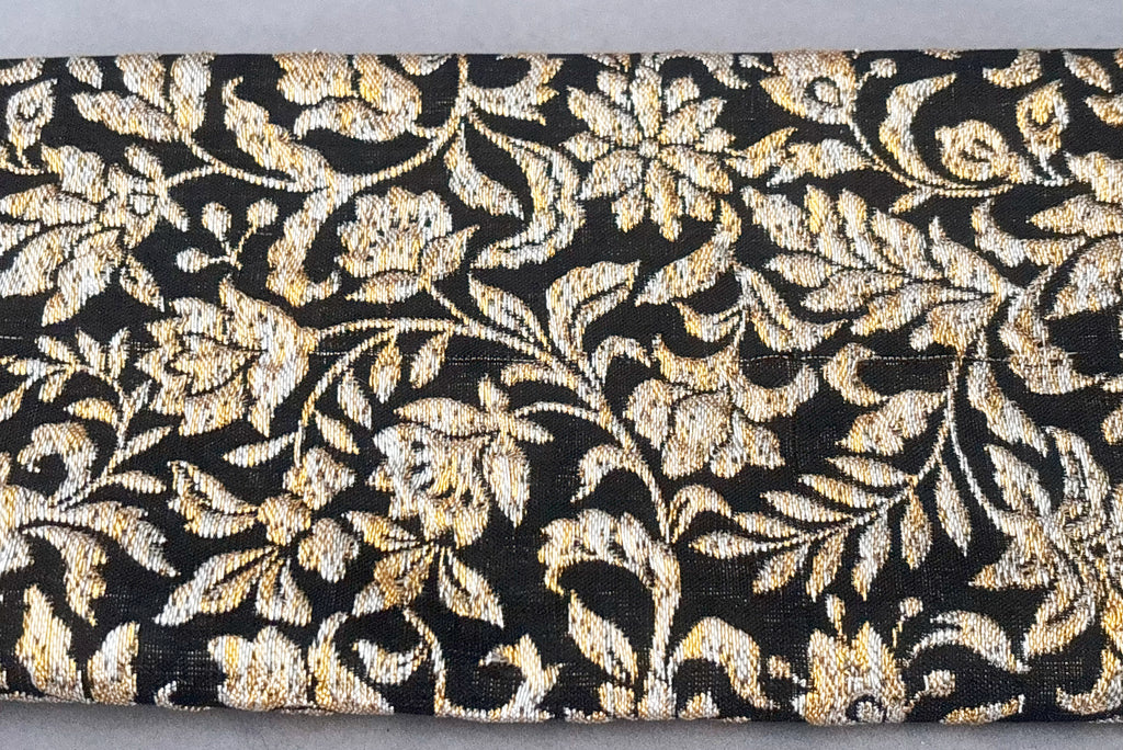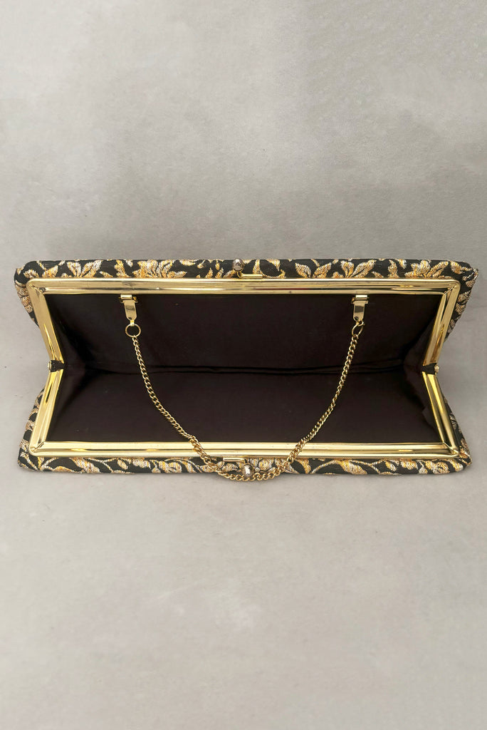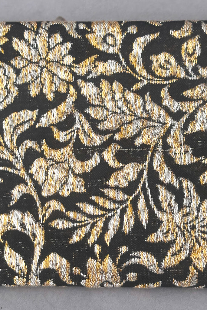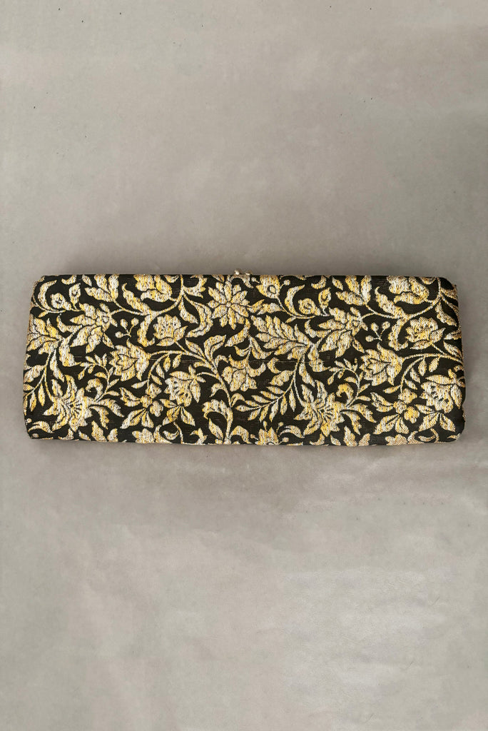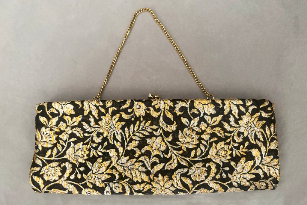 1960s Vintage Black, Silver, and Gold Floral Metallic Brocade Long Clutch Purse w/ Foldout Chain Handle