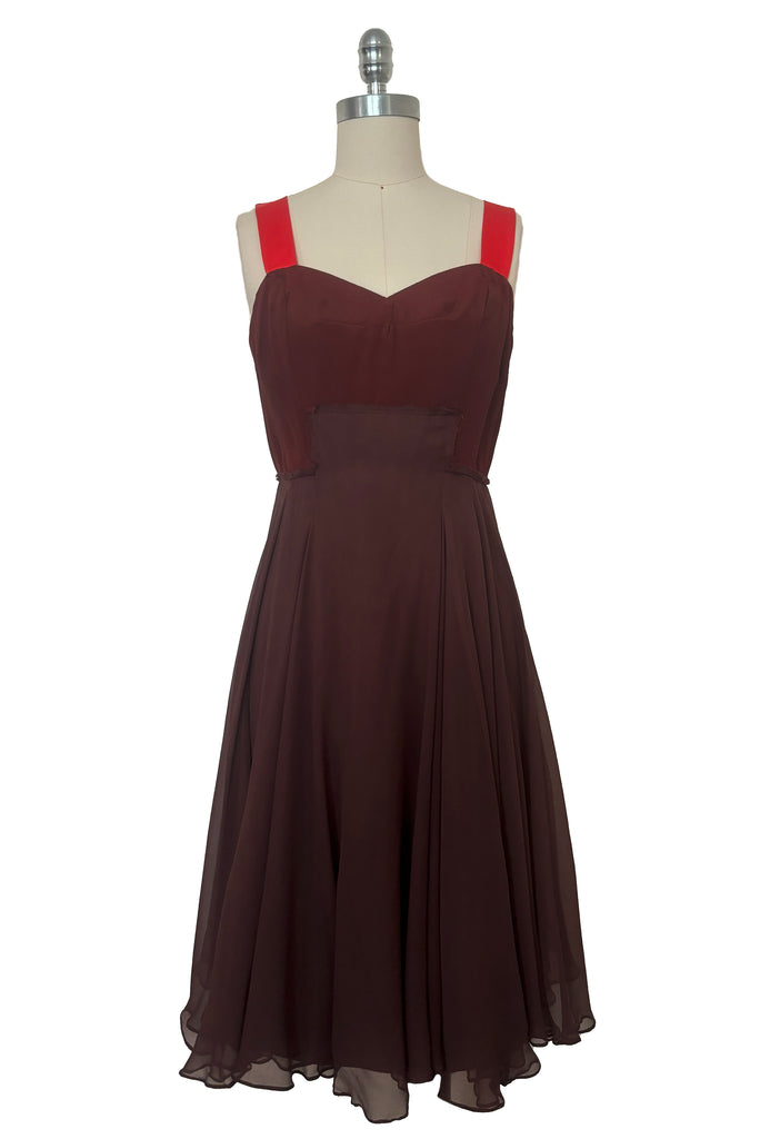 Condition: Excellent vintage condition. One very tiny snag in the top where it looks like a brooch was pinned. One small snag in the silk chiffon, and stress to one area in one seam. Please view the photos carefully.