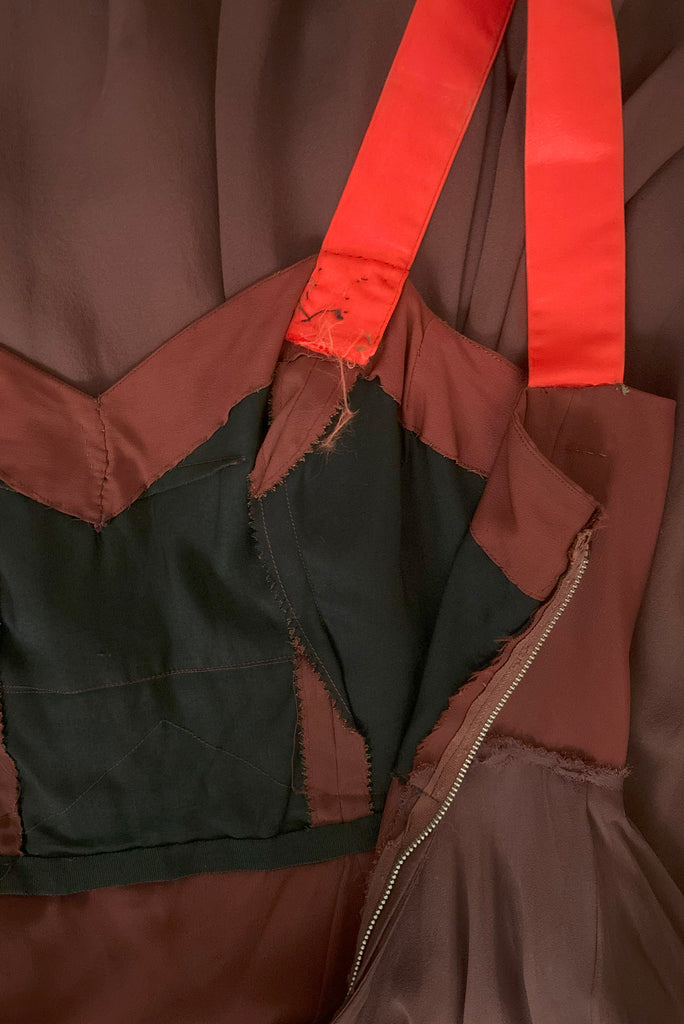 Make a style statement with this 1960s pink and brown silk two-piece cocktail dress. The hot pink silk satin top, backed with luscious orange silk, adds a touch of elegance. The dress itself is crafted from brown rayon crepe, layered with the softest brown silk chiffon for a luxurious feel. The matching orange silk satin straps beautifully complement the top. While the top can be worn independently and exudes its own charm, the dress may require some adjustments to cover the exposed seams before it can be worn without the top. Embrace the retro vibes of the 1960s with this unique and fashionable cocktail dress.