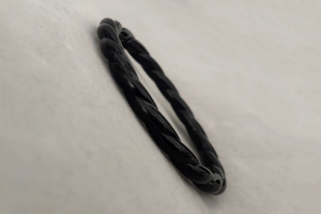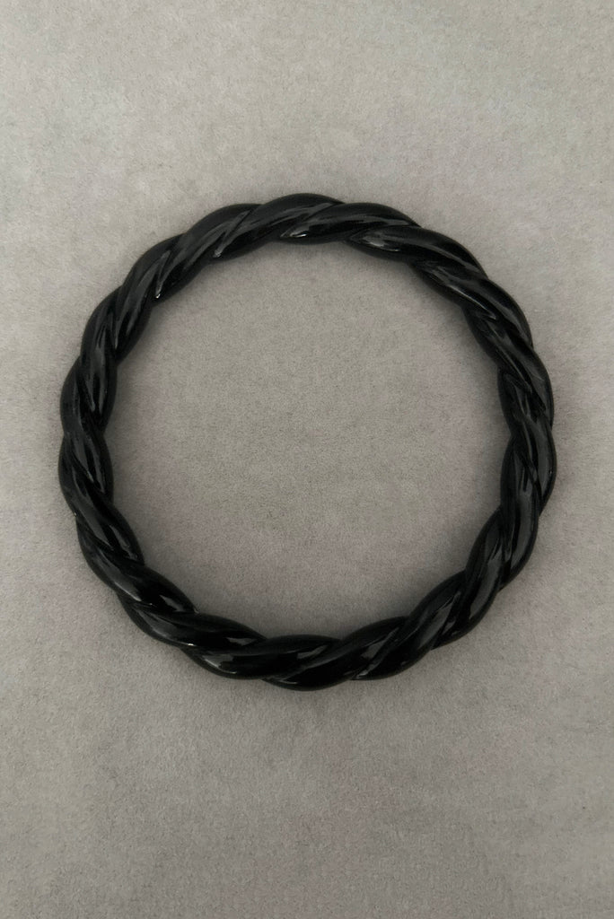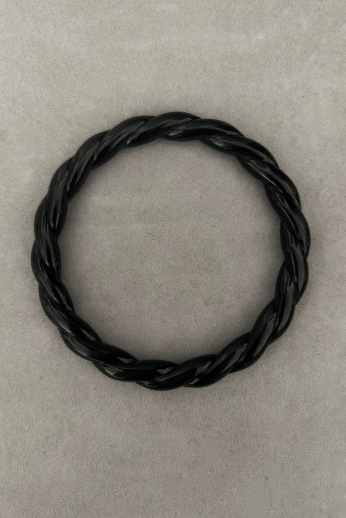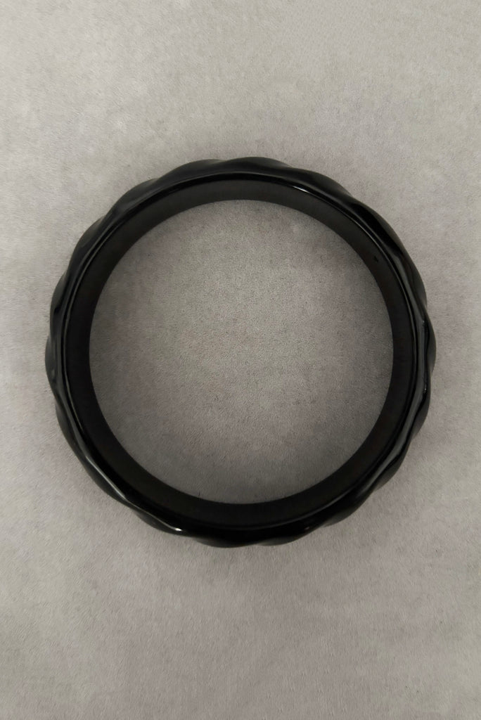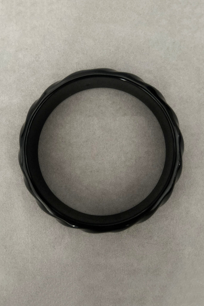 Bold, playful, and unmistakably retro, this 1980s vintage bangle set features three black plastic bracelets, each with its own distinctive texture and design. A perfect mix of sculptural and whimsical, this set captures the fun, expressive spirit of 1980s fashion.
