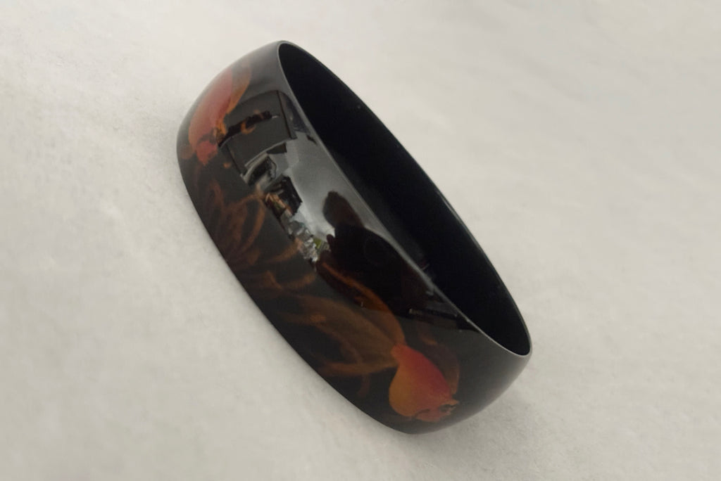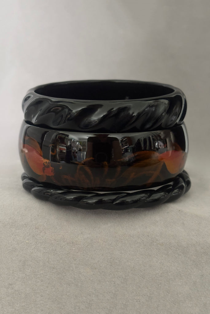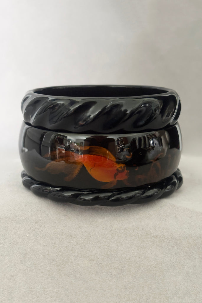 1980s Vintage Black Plastic Orange Goldfish Painted Bangle Bracelet Set of Three (3)