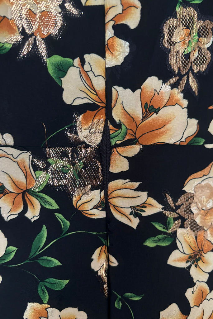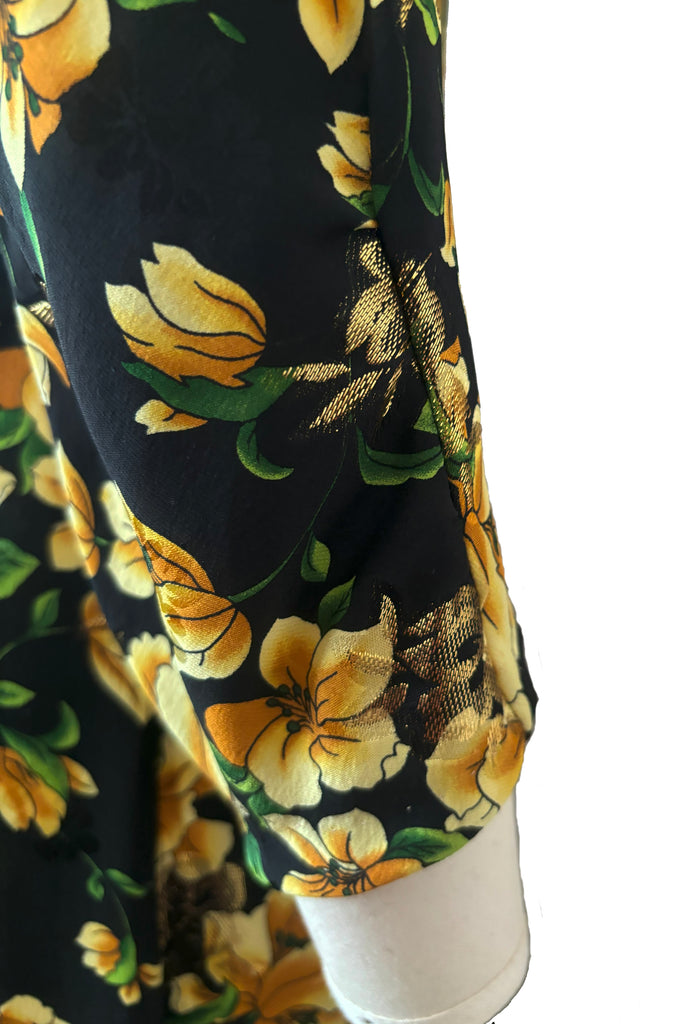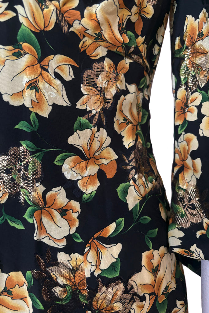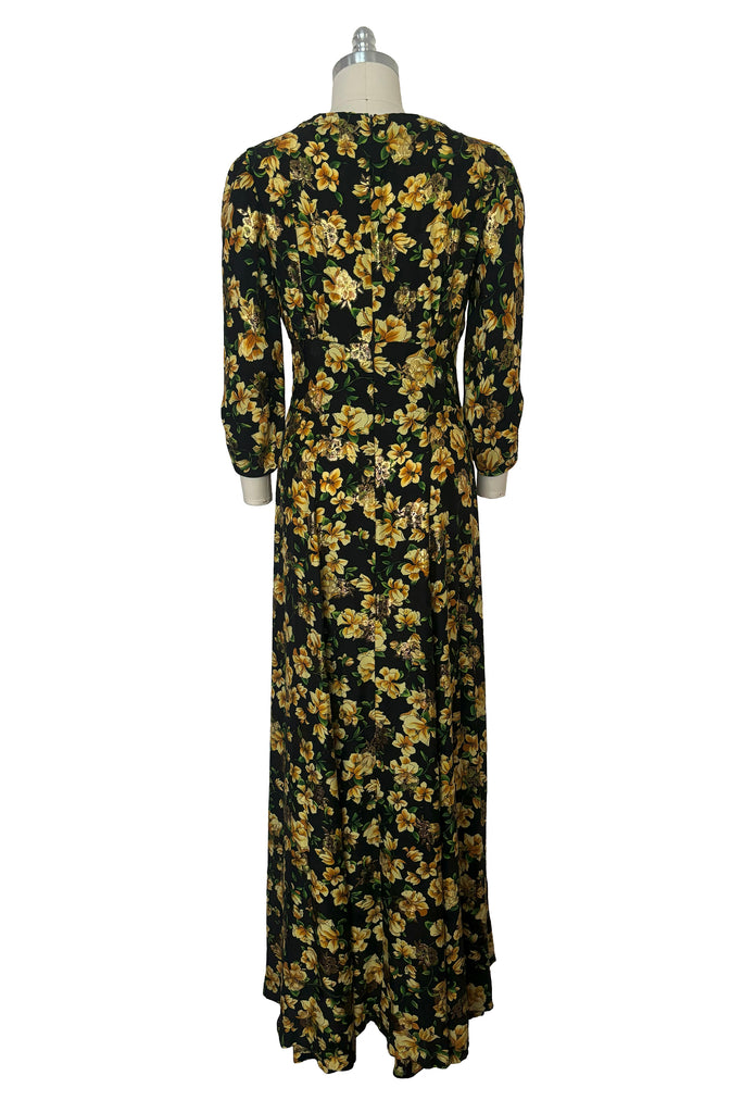 2000s made 1940s Repro Black, Yellow, and Gold Floral Silk and Lurex Evening Gown, Medium to Large