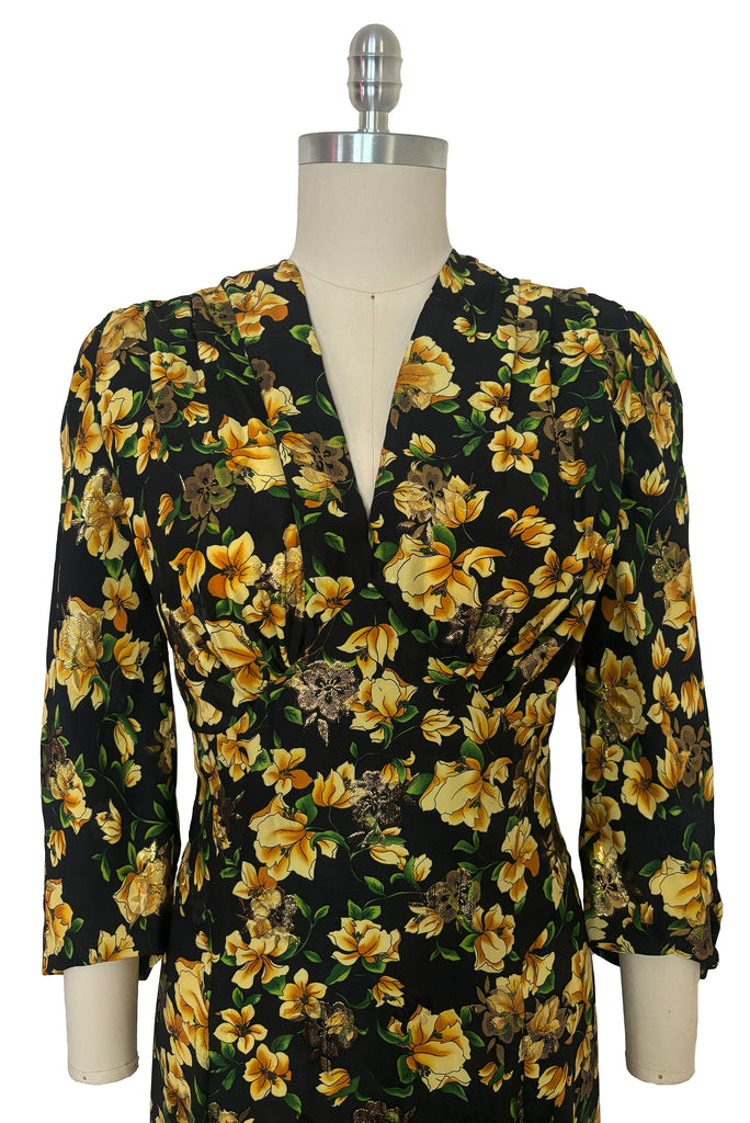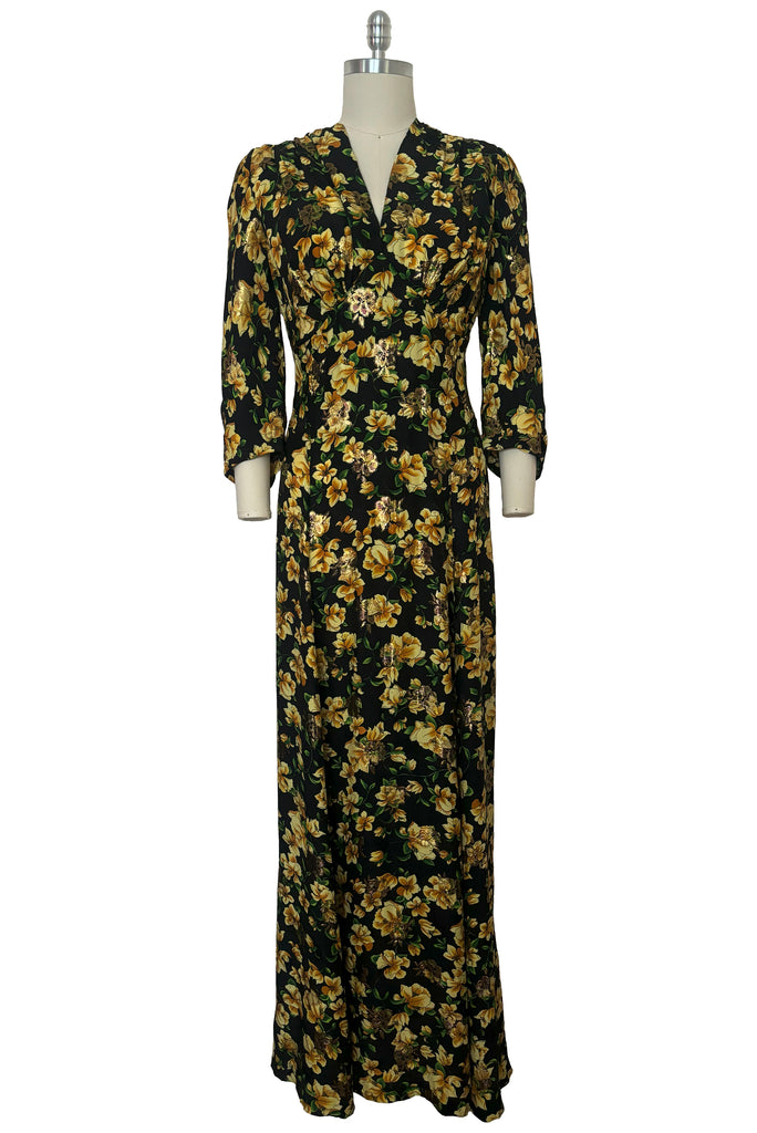 Channel vintage glamour with this early 2000s-made 1940s reproduction evening gown. This stunning black silk dress is adorned with a yellow and green floral print and interwoven with a floral pattern in gold Lurex, exuding timeless elegance. The gown features bias-cut 3/4 sleeves, intricate gathered bust detailing, and a waist underlined in luxurious silk organza. The dramatic sweeping floor-length skirt adds an air of sophistication, making this gown a perfect blend of vintage charm and modern craftsmanship. Elevate any special occasion with this exquisite piece that captures the essence of 1940s fashion.
